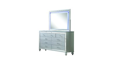 Upgrade your bedroom with this elegant silver bedroom set, designed to bring a touch of glamour and sophistication to any space. The tufted upholstered headboard features built-in LED lighting, adding a soft ambient glow. Framed mirror accents on each piece enhance the luxurious aesthetic, while the sleek silver finish ensures a timeless appeal. The set includes a bed, dresser, mirror, nightstand, and chest, all crafted for both beauty and functionality.